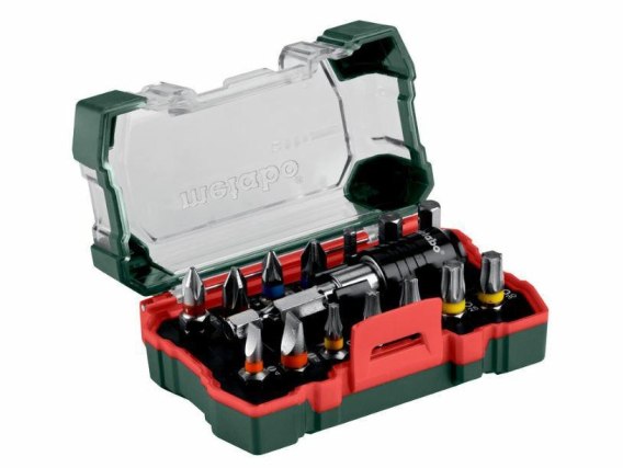 Bity ze stali chromowo-wanadowej (S2) z oznaczeniem barwnym umożliwiającym szybkie i łatwe odnalezienie właściwego bitu; magnetyczny adapter do szybkiej wymiany; wytrzymałe pudełko wysokiej jakości w specjalnym wzornictwie Metabo; wysuwana eurozawieszka