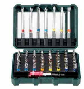 Bity ze stali chromowo-wanadowej (S2) z oznaczeniem barwnym umożliwiającym szybkie i łatwe odnalezienie właściwego bitu; magnetyczny adapter do szybkiej wymiany; wytrzymałe pudełko wysokiej jakości w specjalnym wzornictwie Metabo z wysuwaną eurozawieszką