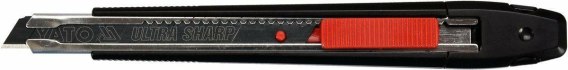 Nożyk z ostrzem łamanym 9mm marki YATO YT-75003. Ostrza wykonane ze stali ULTRA SHARP SK2H pokrytej specjalną czarną powłoką gwarantują wyjątkową ostrość, korpus z odpornego tworzywa ABS. Rękojeść dodatkowo powleczona antypoślizgową powloką wykonaną z TPR. Zapewnia to pewny chwyt oraz wysoki komfort pracy. Metalowa prowadnica zapewnia płynną i bezawaryjną pracę. Ponadto wyposażona jest w system "auto lock", który zabezpiecza ostrze przed przypadkowym wysunięciem lub cofnięciem się podczas pracy, wytrzymując siłę do 20N. Dzięki systemowi "auto lock" nożyk doskonale sprawdza się podczas cięcia grubych materiałów czy w wąskich szczelinach, w których istnieje ryzyko zaklinowania się ostrza.