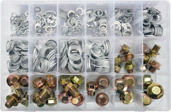 Zestaw 534 sztuk podkładek aluminiowych i korków spustowych do misek olejowych.
