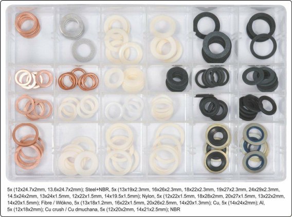 Zestaw 120 sztuk podkładek pod korki spustowe oleju. Całość umieszczono w wygodnym opakowaniu typu "sortownik". Zestaw zawiera podkładki wykonane z aluminium, metalu i kauczuku, nylonu, włókna oraz miedzi.