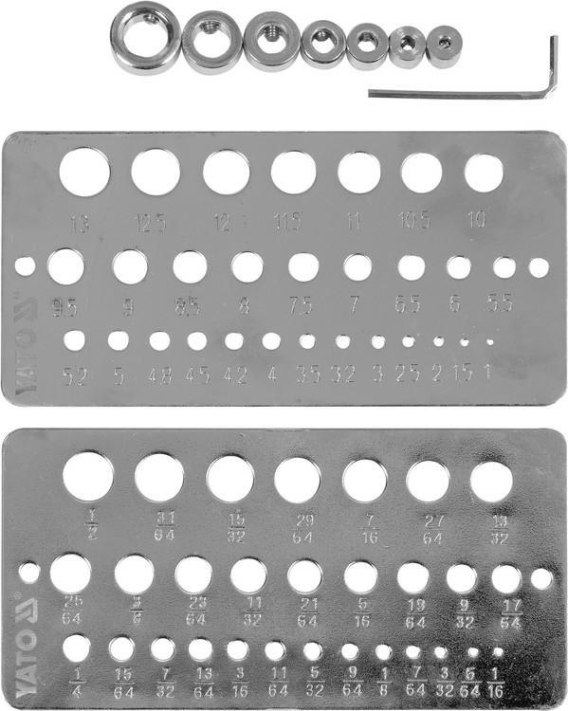 Zestaw 10 szt. składa się z dwóch stalowych płytek z otworami do kontroli średnic.
