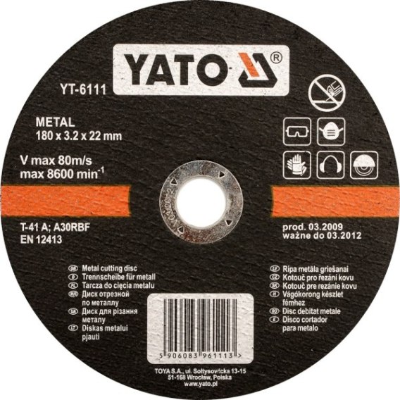 Tarcza do cięcia metalu marki YATO wykonana z wysokogatunkowego materiału ściernego o odpowiedniej twardości i granulacji.