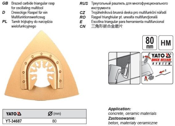 Akcesoria Yato wyposażone są w mocowanie Quick Release System, który poza narzędziem Yato Yt-82220 pasuje również do narzędzi takich firm jak: Bosch OIS, Dremel, PowerUp, Tryton, Graphite