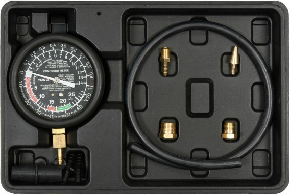 9-częściowy zestaw przeznaczony do pomiaru ciśnienia w układach podciśnieniowych, gaźnikowych, kolektorach ssących, Servo. Wykorzystywany także do badania układów hamulcowych, zaworów selenoidowych, elektryczno-podciśnieniowych, wtryskiwaczy, elektrycznych i mechanicznych pomp paliwowych oraz diagnostyki zaworów.