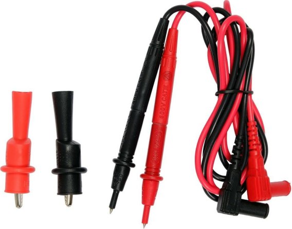 Zestaw sond pomiarowych wraz z krokodylkami. Pasują do większości mierników na rynku. Ostre styki ze ściąganymi kapturkami. Po ściągnięciu kapturka można